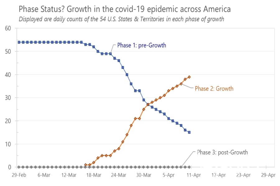 The chart below provides a U.S. “system view” with a summary over time of the number of states that are in each phase of exponential growth, reinforcing the point that on any given day we are dealing with different dynamics across the nation as well as changes happening within each state.